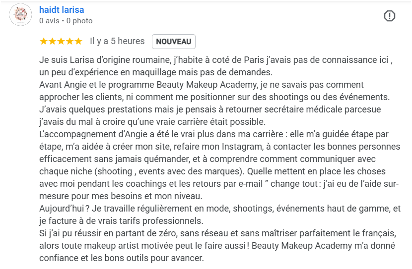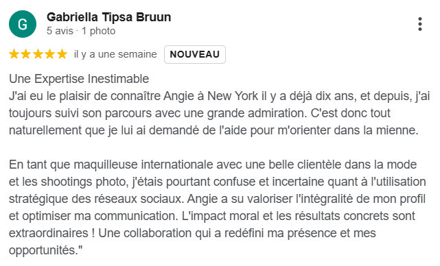 Angie m'a redonné confiance en moi comme jamais. Ses coachings personnalisés, ses techniques de maquillage de dingue et son approche business m'ont fait voir l'avenir complètement différemment.